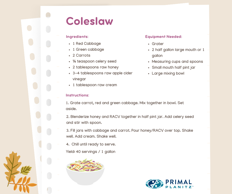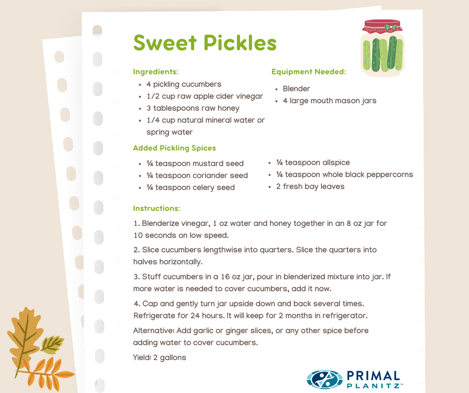 I also received a lot of positive feedback about the salt-free raw coleslaw and pickles I made for the Primal Diet™ Conference. The pickles were too spicy for Asa so I adjusted the recipe and added only a tiny amount of each spice, minus the peppercorns, so it works really well for kids.