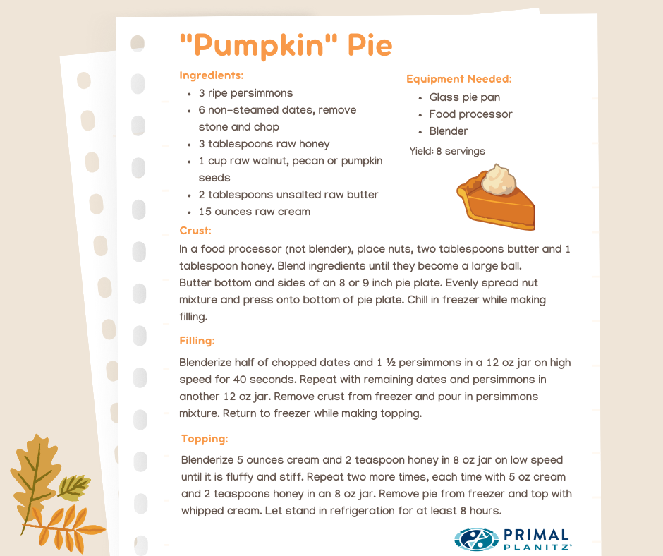 Aajonus came up with a brilliant alternative for pumpkin pie on P.140 in Recipe for Living Without Disease. If you haven’t tried it do yourself a favor and get some native or Japanese persimmons and give it a go. Our friends affectionately call this one “Persimmkin Pie” and Asa has requested I make one for his birthday this year. When celebrating special occasions, our family’s tradition is to serve up healthy and delicious raw pies. With each version I make, Phoenix says “It’s the best one yet!”. I’ve been improving the texture and taste and now find myself using little to no dates for the filling and add in more eggs and butter to create a custard.