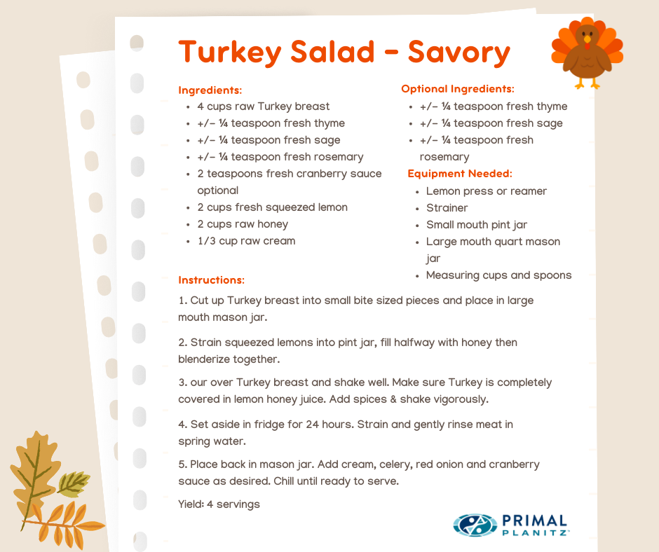 Over the past year, my love of turkey has grown and I have made our ceviche with it regularly. I actually prefer it over chicken these days. For other meals, I slice turkey like sashimi which gives it a wonderful texture and display. I’m pleased to report that last year’s turkey dish for our Thanksgiving potluck was a huge success! I arranged the sliced turkey out on a platter in a pleasing fashion. Next, I blended up savory spices such as sage, thyme and rosemary in a half pint mason jar. Once blended, I topped the jar off with raw cream and added a hint of red onion and a whisper of garlic into the mix. Then I set it in the fridge for a few hours before serving. An hour before mealtime, the platter of sliced turkey comes out of the fridge to warm up to room temperature and I carefully pour the savory cream sauce over the top in a beautiful display before serving. Adding a sprig of fresh rosemary tucked on the side for a touch of color as well as grinding whole peppercorn over the top could be a wonderful added touch for guests new to the Primal Diet™. It’s simple, easy to prepare, and delicious.